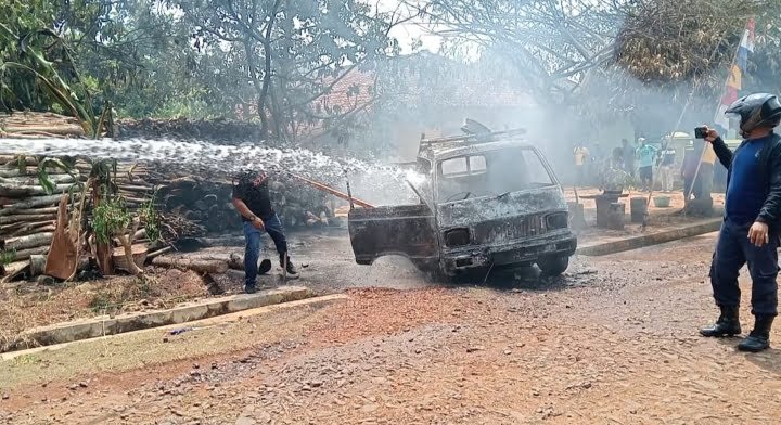 Petugas pemadam saat berjibaku memadamkan kobaran api. Sumber: Hadi JakariyaSebuah mobil Suzuki Carry jenis pick-up dengan nomor polisi B 1085 SS terbakar di halaman rumah warga di Dusun 6, Desa Mataram Baru, Kecamatan Mataram Baru, Lampung Timur, pada siang hari, Minggu, 18 Agustus 2024.